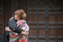 手と手を取り合い寄り添う新郎様と新婦様。玉垣(赤い柵)がさらに良い雰囲気です。