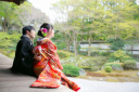 庭園を背景に新郎新婦様が向かい合って正座 とても雰囲気のある写真になりました