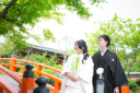 庭園を背景に新郎新婦様が向かい合って正座 とても雰囲気のある写真になりました