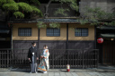 京のまちを歩くお二人、新婦様を新郎様がエスコートしています。