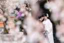 桜と一緒に新婦様を撮る新郎様、少しはにかんだ新婦様の顔が初々しい一枚。