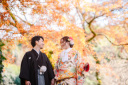手を繋いで一緒に紅葉狩りをしているようなショット!お二人の笑顔が素敵です
