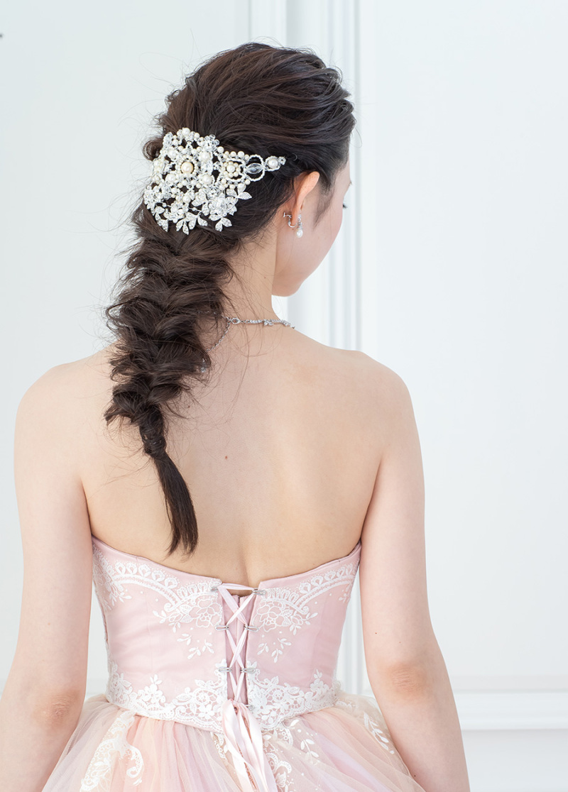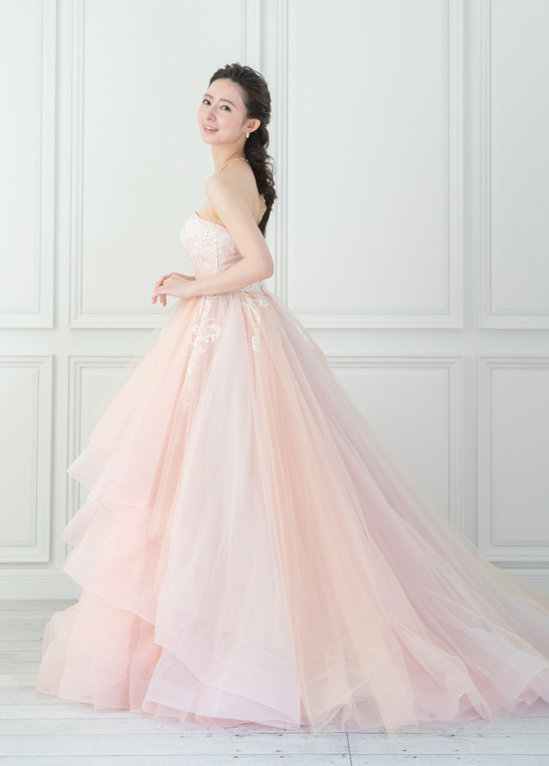 人気のグラデーションカラー。ピンクベースのグラデーションと輝くグリッターレースがポイント。スカートのフリル部に施したホースヘアとチュールの風合いが絶妙なバランスで仕上がりました。