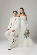 お互い白でお揃いコーデ☆旦那様が椅子に座ると奥様のマーメイドドレスよりが際立ちますね(*^-^*)♡