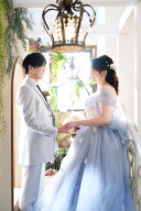 青と赤のコントラストがいい感じのアンティーク感♪二人の笑顔も素敵!