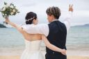 青くてきれいな海と空、白いウェディングドレスが良く似合う新婦様と、かっこいい新郎様…♡