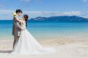 背中を合わせてお二人それぞれ違う目線で♥ビーチを背景に広角なご撮影なのでダイナミックな雰囲気をお楽しみいただけます♪沖縄の海を思い出していただけるショットです♪