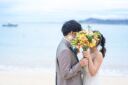 ビーチで少しかしこまったフォーマルショット。ご新婦様の青色のハクレイとブーケが、バックに映る海とマッチしていて統一感のあるお写真に仕上がりましたね(*^^)