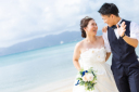 おふたりのご希望でビーチ撮影にもトライしてみましたよ♪風は強いですが、海は青く、心なしかおふたりの真上だけ雲もスッキリ。