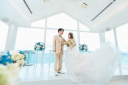新郎様のこのジャンプ!もう少しで水平線を超えそうなくらいの大ジャンプで、お二人ともとても楽しそうな表情をされていて本当に素敵です^^