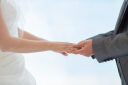 手を取り合って誓いの言葉を交わすシーンです。ご新郎様が優しい笑顔でリードします。