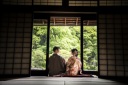 柔らかい桜のピンクと、おふたりの着物の色、そして番傘の色味がコントラストに引き立て合っていますね☆