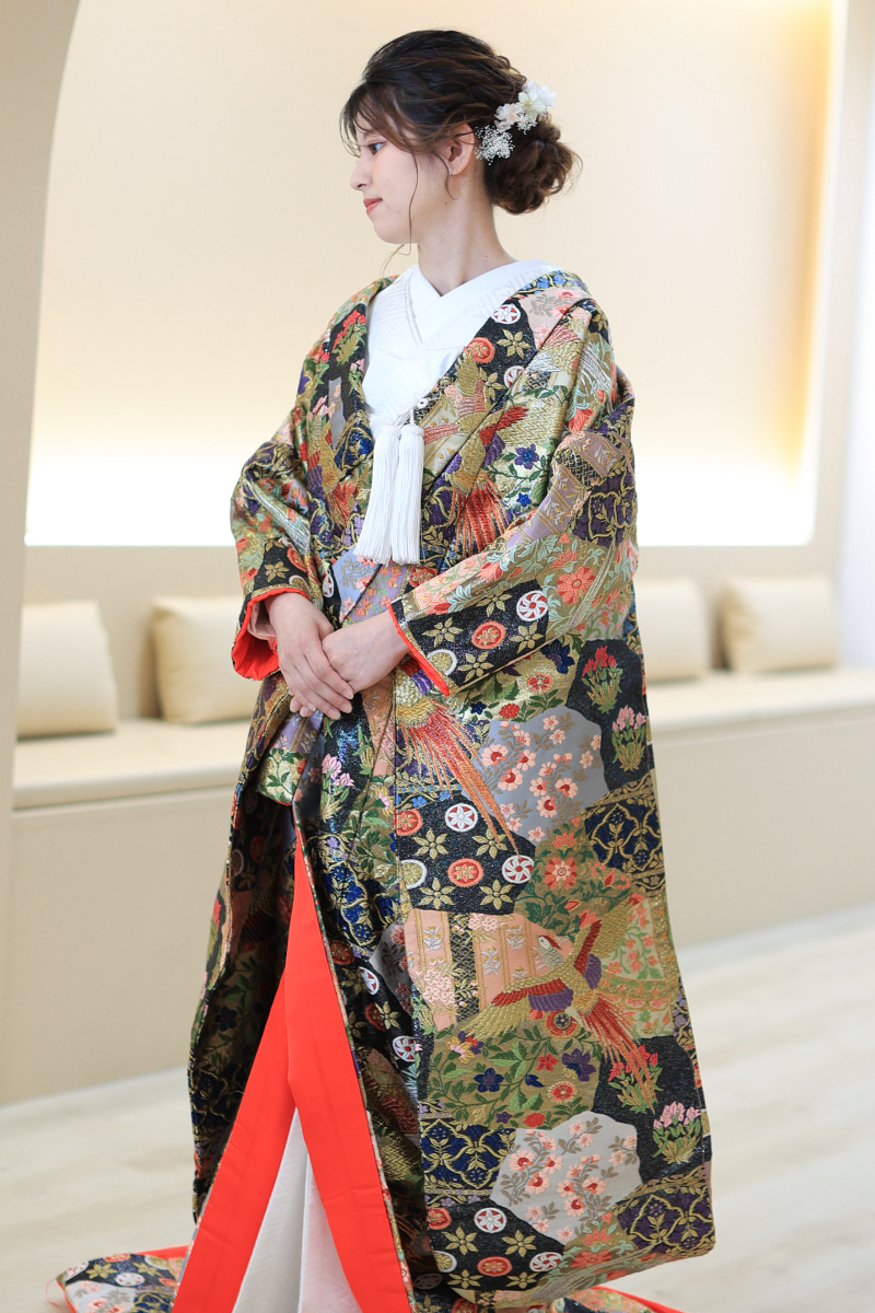 衣装グレード|75,000yen(税込82,500yen)黒色の打掛ですが、色々なお色味が入っているので着ていただくと明るいデザインになっております。