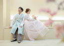 カラードレスにお着替えをし、ヘアはダウンスタイルにチェンジして印象がガラッと変わりました♩スタジオのカーテンでは明かりを調節するとクールなお写真も残せます*