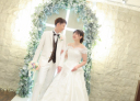 ピンク色のドレスとブラウンのタキシードにお衣裳チェンジ。大きなドライフラワーがさらにお洒落さアップ。