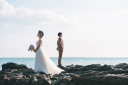 ぎゅっと寄り添い合うおふたりと、石垣島の海。絵になっています!
