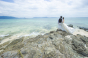 青い海と青い空の下で新郎さんの腕にぎゅ♪ほっこりしますね^^