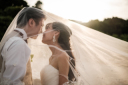 ロマンチックな雰囲気のおふたり...。背景には優しい色合いの海が美しく広がっています。