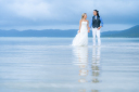 さて、お次はビーチでの撮影。おふたりの背景には石垣ブルーの海が広がります。