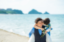 足跡が陰影を作り出す砂浜で抱き寄せ合うお二人を。円状に広がるドレスも大変美しいですね。