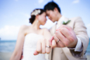 新郎様に向けて満面の笑みを見せる新婦様がポイント!後ろに広がるスカイブルーの海も二人を主役として引き立てています。
