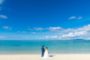 新郎様と新婦様を木のフレームにはめこんで。グラデーションがかかったように一体になった海と空が美しくふたりが絵になる一枚。