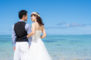 石垣ブルー広がる海をバックに、新郎様が新婦様をエスコートして。