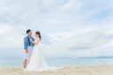 南国の葉っぱを背景に、距離をあけて立つおふたりを。