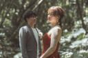 風に吹かれてふわっとなびくベール、見つめあうおふたり。