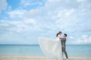 青い海と、青い空を背景に、向かいあって見つめあうおふたり。