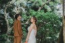 おふたりの振り向きショットを、南国らしい葉っぱ越しに。