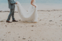 白い砂浜の上を歩くおふたりの姿を、遠くからぱしゃり。