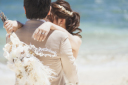 ぎゅっと寄り添い合っているおふたりを、きらきらの海を背景に。