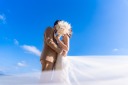ぎゅっとハグしているおふたりと、風になびいているベール。