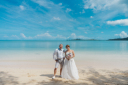 ビーチでお散歩です♪真っ白な砂浜に青い海、おふたりの姿が絵になっています!