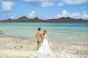 新婦様をふわっと抱き上げる新郎様。青い景色によく映えています!