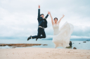 波打ち際でお顔の距離を近づけるおふたり。絵になっています!