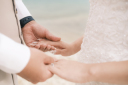 ビーチに座って手を重ねて、おでここっつん。ロマンティックです。