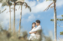 南国らしい大きな葉っぱのかげで、ぎゅっとハグするおふたり。