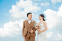 石垣ブルーの海を背景に、距離をあけて立つおふたり。