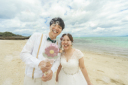 ビーチにて撮影スタート!浜辺に座っているおふたりと青い海、素敵です!!