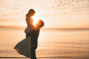 ビーチに座って手を重ねるおふたり。ロマンティックです!