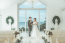 石垣島の青い海を背景に、手を取り合って見つめあうおふたり。