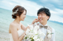 お次は、ビーチ撮影!石垣ブルーの海を背景にシンプルなショットを。