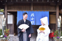 茶色の紋付袴に、新婦様の朱色の色打掛でとてもオシャレです。