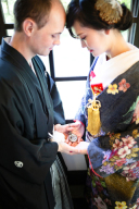 ご新郎様の手にはリング。後ろでは嬉しそうなご新婦様。