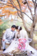 純白の衣装がとてもお似合いのお二人。秋の柔らかい光と鮮やかな紅葉の中で、より一層美しく引き立ちます。