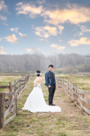 ナチュラルなウェディングドレスとタキシードをお選びいただきました。牧場の雰囲気にもぴったりです!