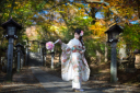 窓から見えるモミジを背に、シンプルなドレスでさらに上品に。