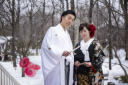 雪と青空が広がる中、優しく新婦様を抱き寄せる新郎様♪